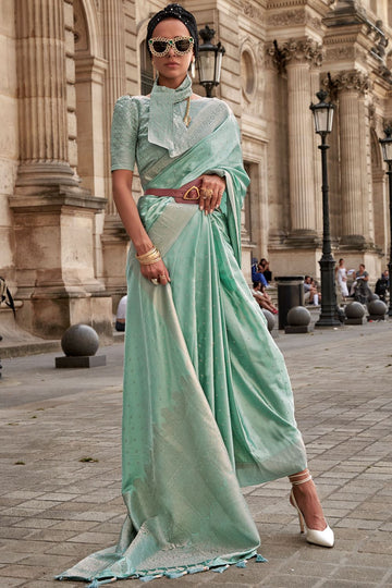 Saree color - Mint green. Fabric - Pure satin nylon silk. Work/Pattern - Weaving. Saree...