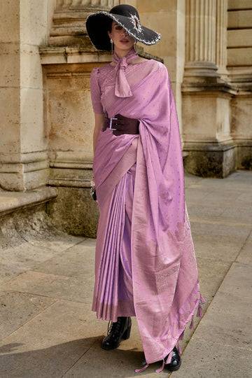 Saree color - Onion pink. Fabric - Pure satin nylon silk. Work/Pattern - Weaving. Saree...