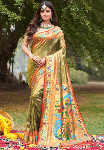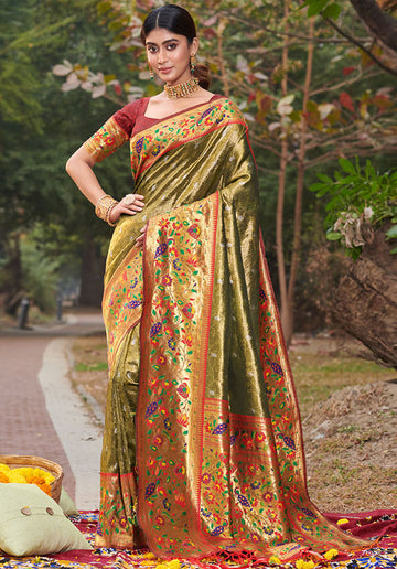 Saree color - Olive green. Fabric - Paithani silk. Work/Pattern - Zari and woven work....