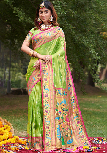 Saree color - Parrot green. Fabric - Paithani silk. Work/Pattern - Zari and woven work....