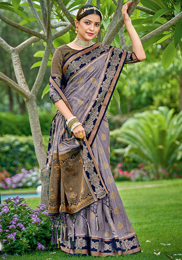 Saree color - Smoke grey. Fabric - Banarasi silk. Work/Pattern - Weaving pallu and border....