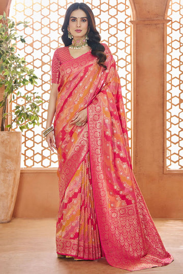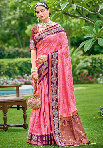 Saree color - Pink. Fabric - Banarasi silk. Work/Pattern - Weaving. Blouse Color - Pink....