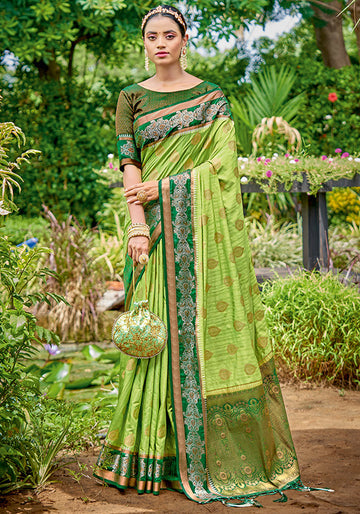 Saree color - Lime green. Fabric - Banarasi silk. Work/Pattern - Weaving pallu and border....