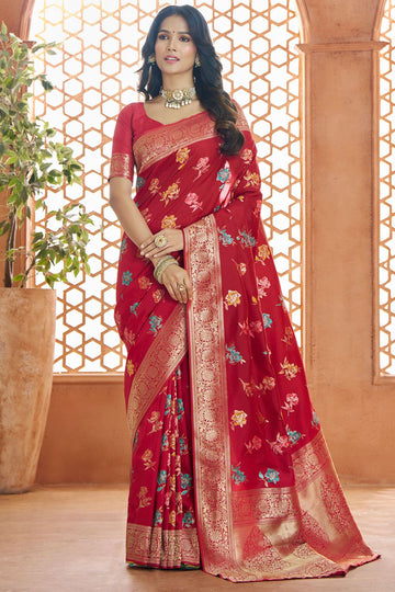Saree color - Scarlet red. Fabric - Pure banarasi silk. Work/Pattern - Zari weaving. Saree...