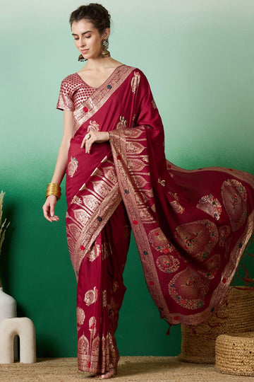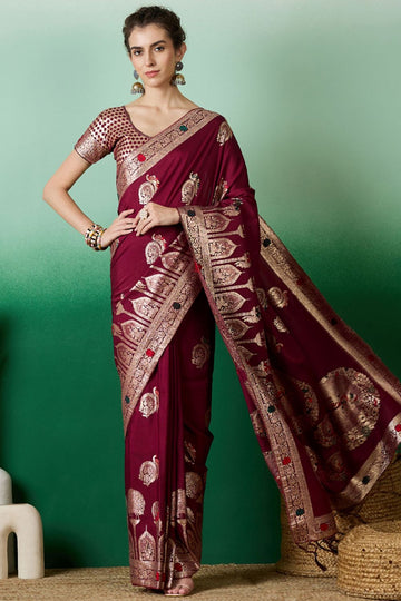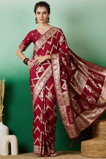 Saree color - Maroon. Fabric - Staple dola jacquard.. Work/Pattern - Weaving work. Saree Length...