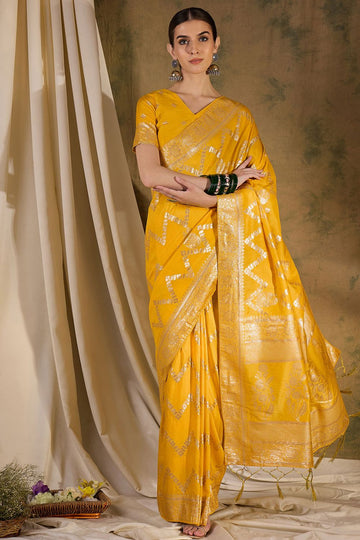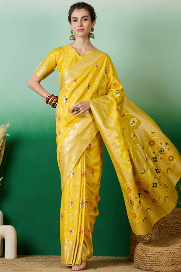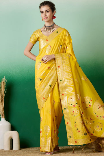 Saree color - Yellow. Fabric - Staple dola jacquard.. Work/Pattern - Weaving work. Saree Length...