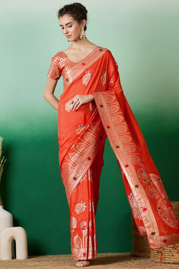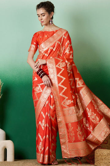 Saree color - Orange. Fabric - Staple dola jacquard.. Work/Pattern - Weaving work. Saree Length...