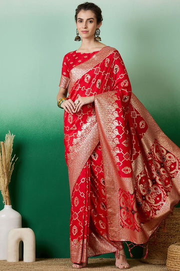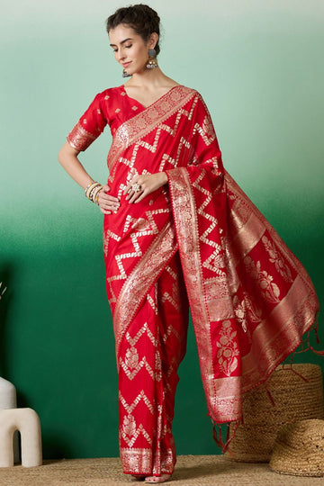 Saree color - Red. Fabric - Staple dola jacquard.. Work/Pattern - Weaving work. Saree Length...