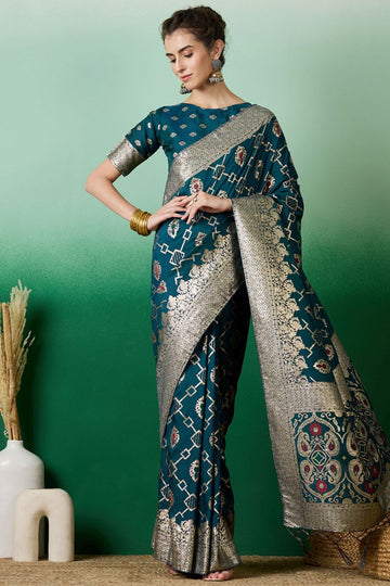 Saree color - Teal blue. Fabric - Staple dola jacquard.. Work/Pattern - Weaving work. Saree...