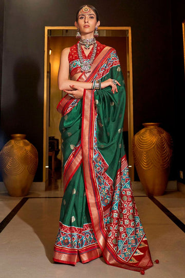 Saree color - Bottle green. Fabric - Mercerized sigma silk. Work/Pattern - Classical patola design...