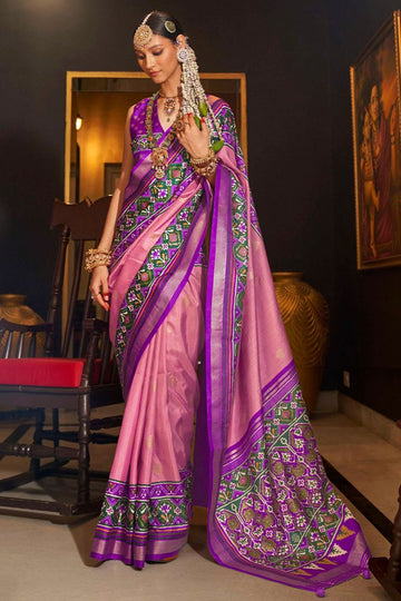 Saree color - Carnation pink. Fabric - Mercerized sigma silk. Work/Pattern - Classical patola design...