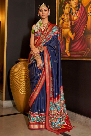 Saree color - Navy blue. Fabric - Mercerized sigma silk. Work/Pattern - Classical patola design...