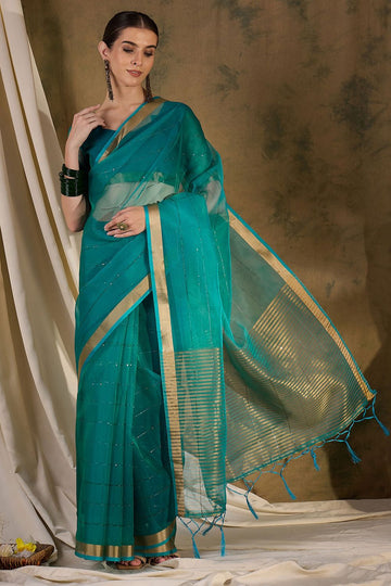 Saree color - Rama green. Fabric - Organza silk. Work/Pattern - Weaving work. Saree Length...