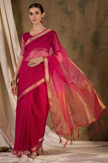 Saree color - Rani pink. Fabric - Organza silk. Work/Pattern - Weaving work. Saree Length...