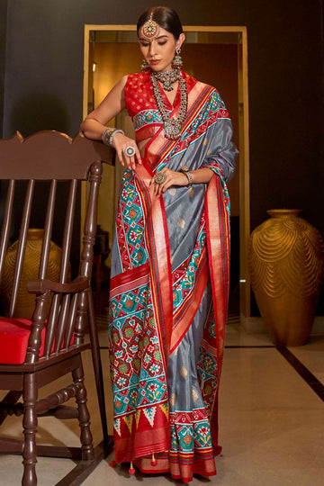 Saree color - Stone grey. Fabric - Mercerized sigma silk. Work/Pattern - Classical patola design...