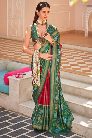 Saree color - Pine green. Fabric - PV silk. Work/Pattern - Patola design foil print...