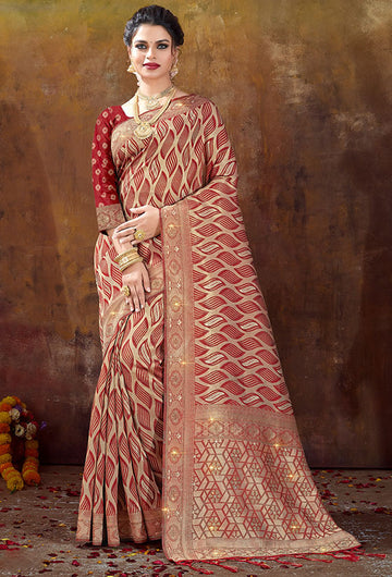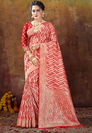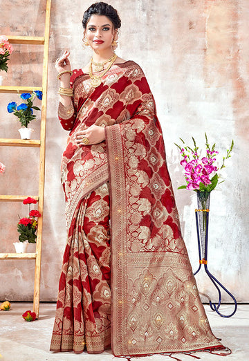 Saree color - Hot red. Fabric - Organza. Work/Pattern - Weaving. Blouse Color - Hot...
