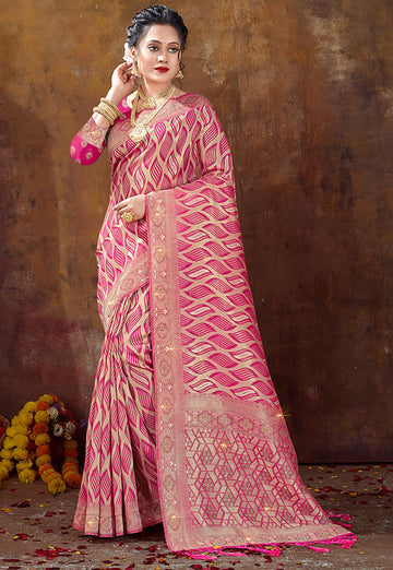 Saree color - Rani pink. Fabric - Organza. Work/Pattern - Weaving. Blouse Color - Rani...