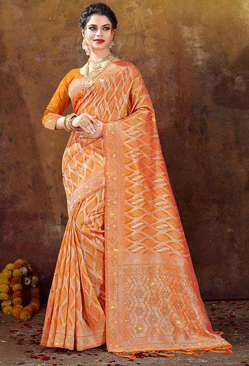 Saree color - Tangy orange. Fabric - Organza. Work/Pattern - Weaving. Blouse Color - Tangy...