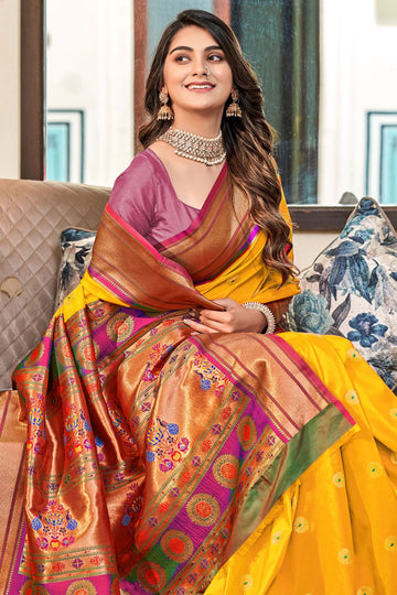Saree color - Maize yellow. Fabric - Peshwai paithani silk. Work/Pattern - Weaving. Saree Length...