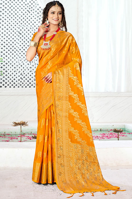Golden Yellow Banarasi Silk Woven Saree for Festival