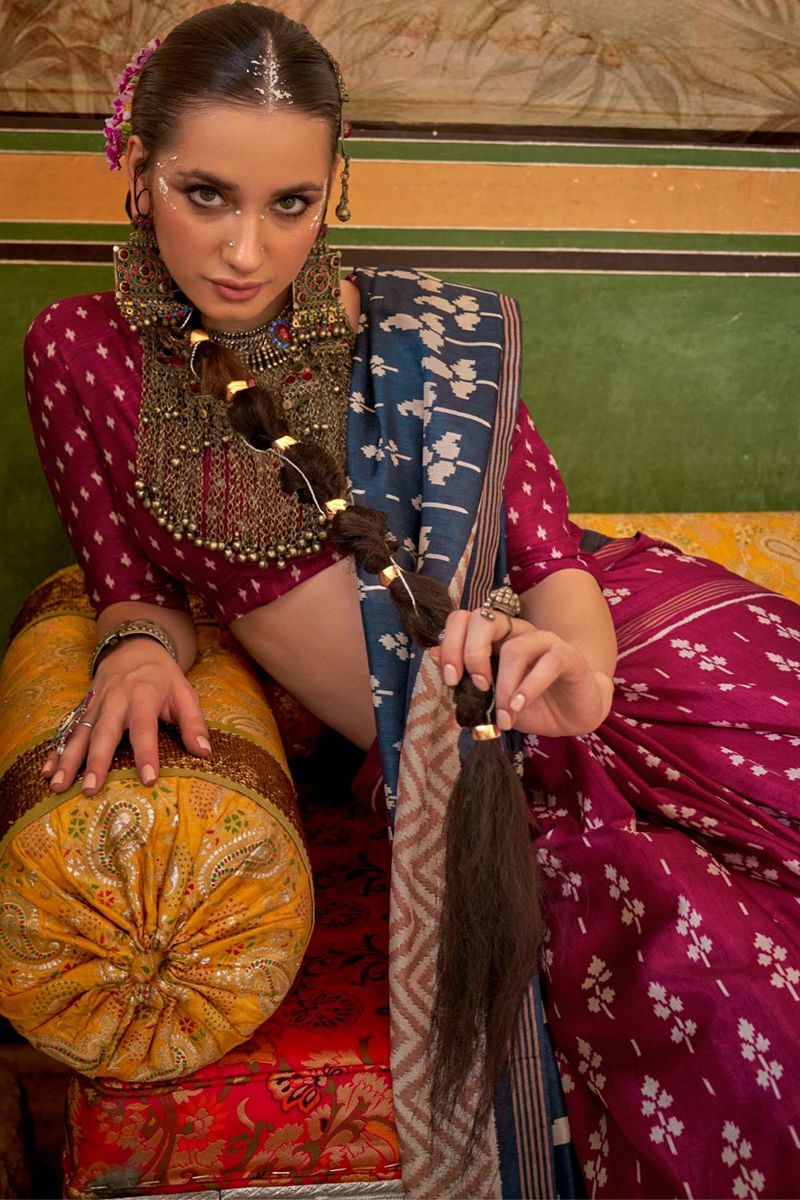 Magenta and Navy Blue Aqua Finish Silk Saree