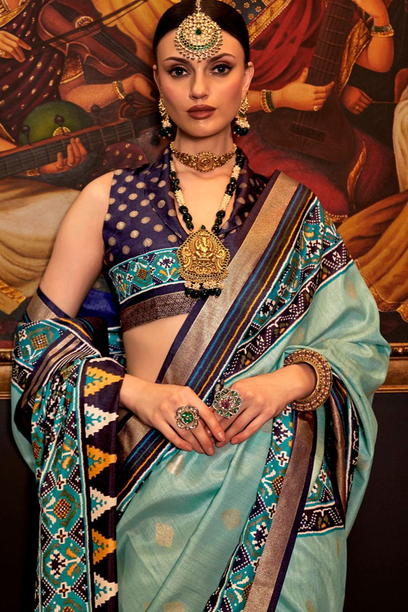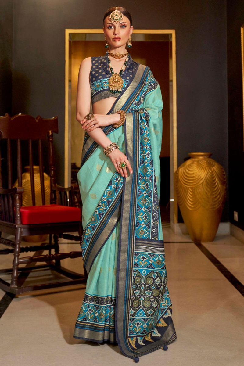 - Work/Pattern - Classical patola design and elegant gold print with aqua finish.