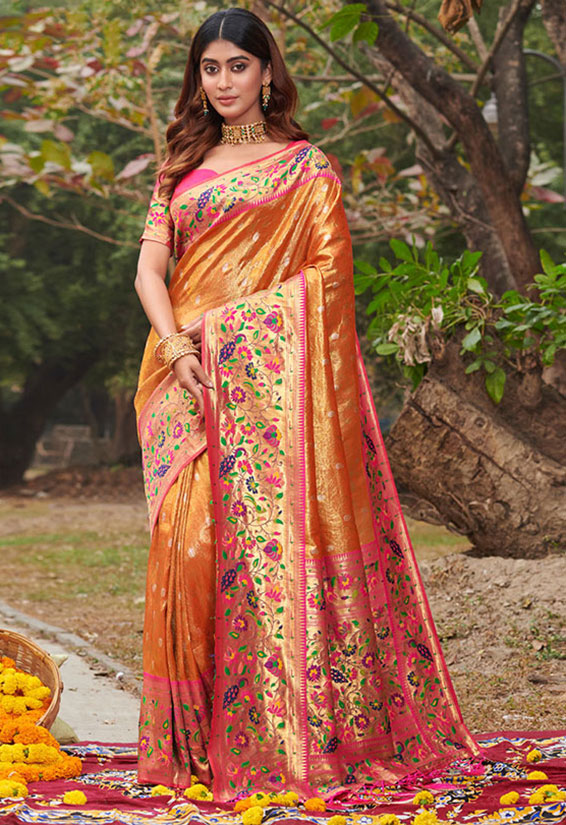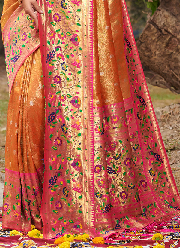 Orange Paithani Silk Zari Weaving Work Saree