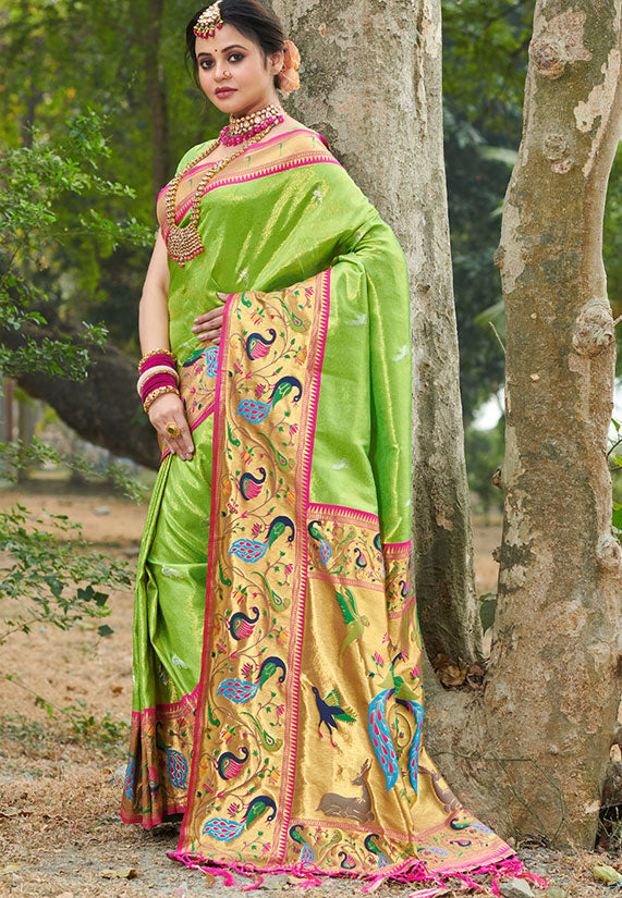 Parrot Green Paithani Silk Zari Weaving Work Saree