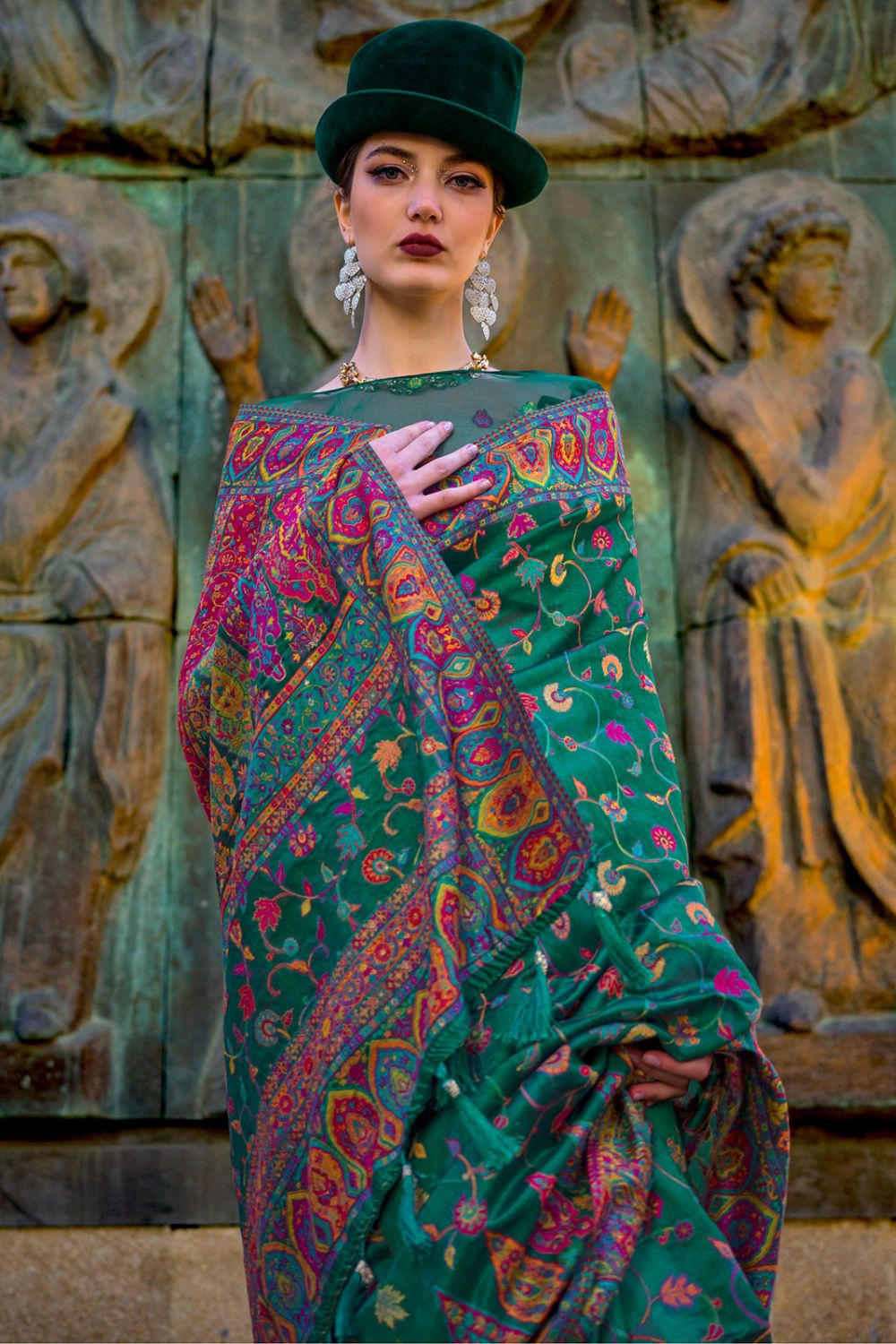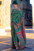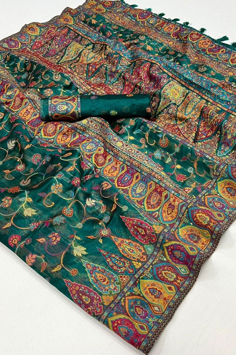 Pine Green Kashmiri Handloom Weaving Organza Festival Wear Saree