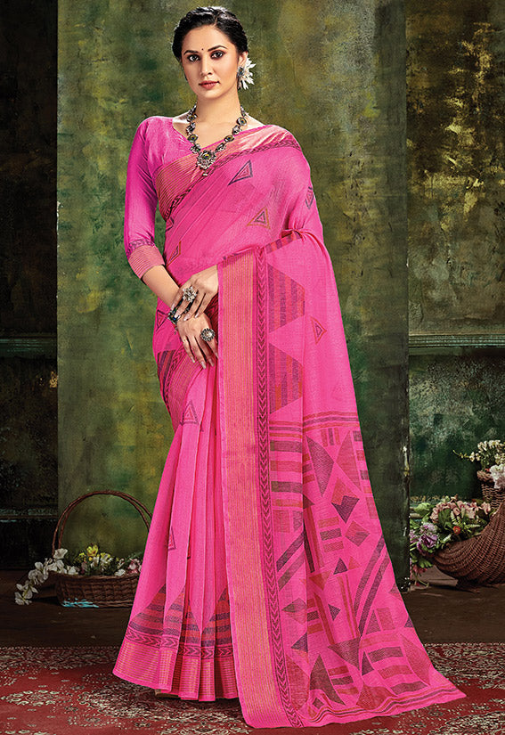 Pink Printed Cotton Saree for Party