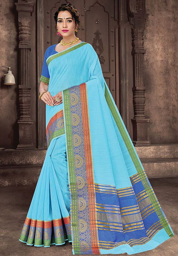 Sky Blue Cotton Handloom Saree for Festival